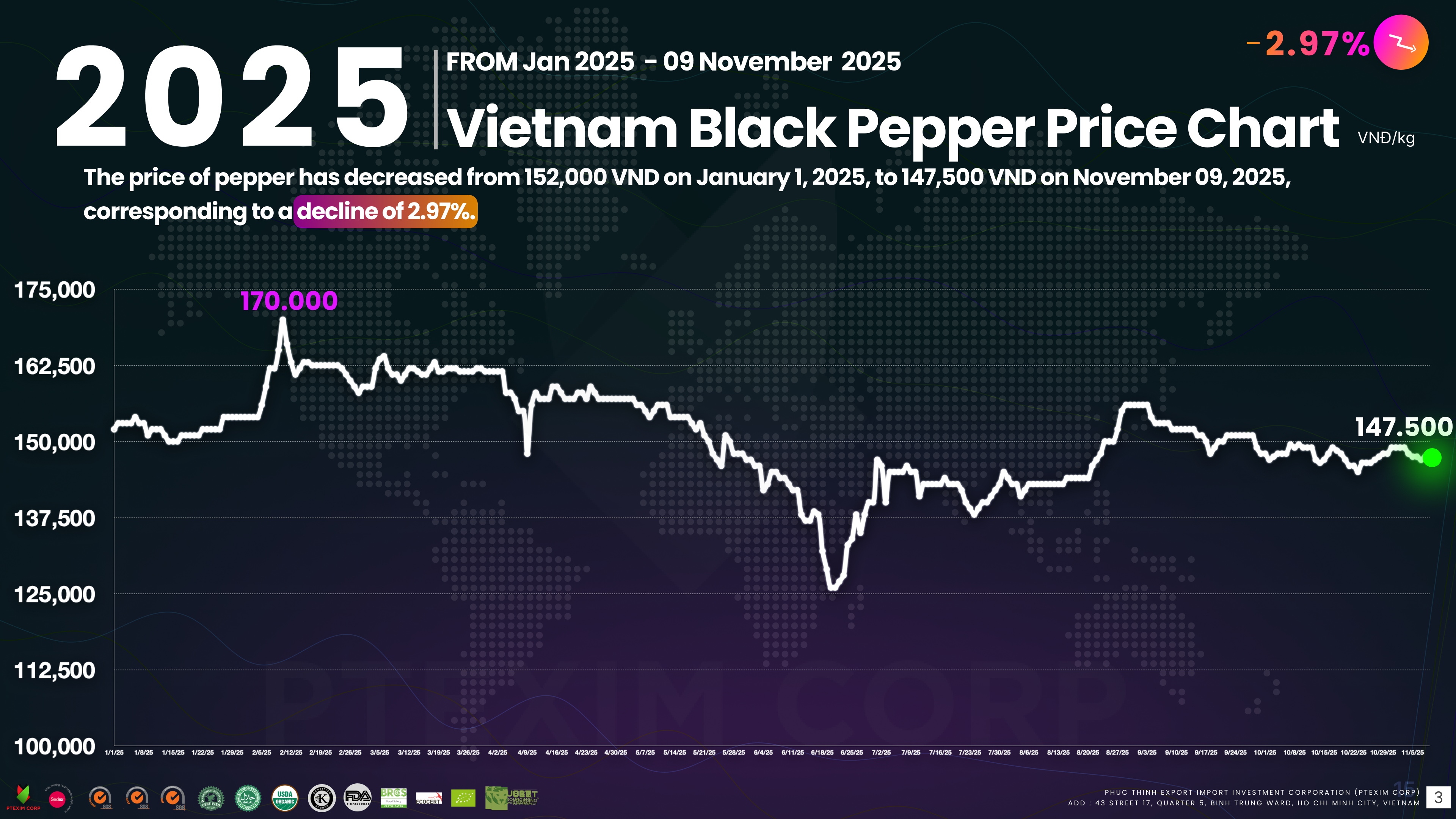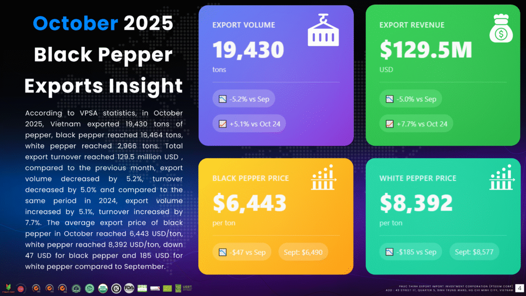 In October 2025, Vietnam exported 19,430 tons of pepper, black pepper reached 16,464 tons, white pepper reached 2,966 tons. Total export turnover reached 129.5 million USD , compared to the previous month, export volume decreased by 5.2%, turnover decreased by 5.0% and compared to the same period in 2024, export volume increased by 5.1%, turnover increased by 7.7%. The average export price of black pepper in October reached 6,443 USD/ton, white pepper reached 8,392 USD/ton, down 47 USD for black pepper and 185 USD for white pepper compared to September.